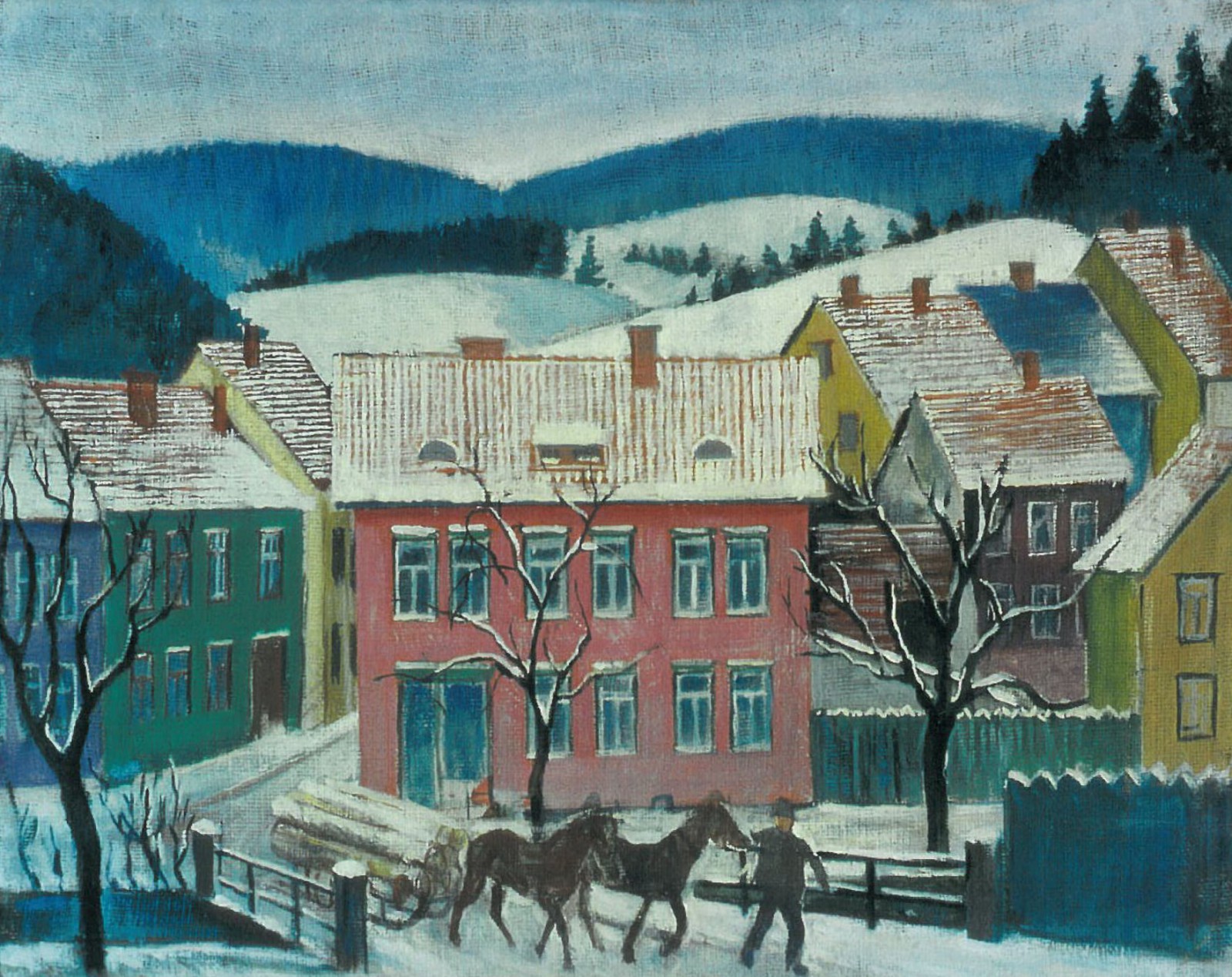 Thüringer Dorf im Schnee und Pferdegespann