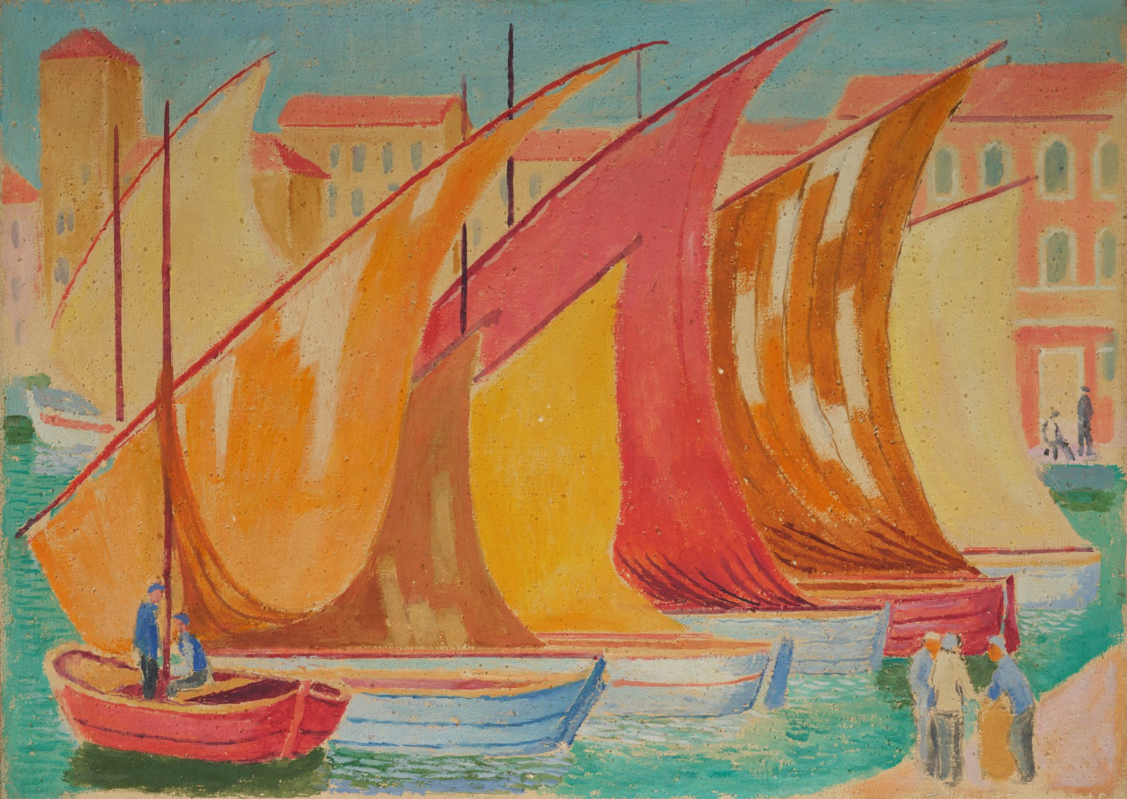 Segel gelb-root im jugoslawischen Hafen