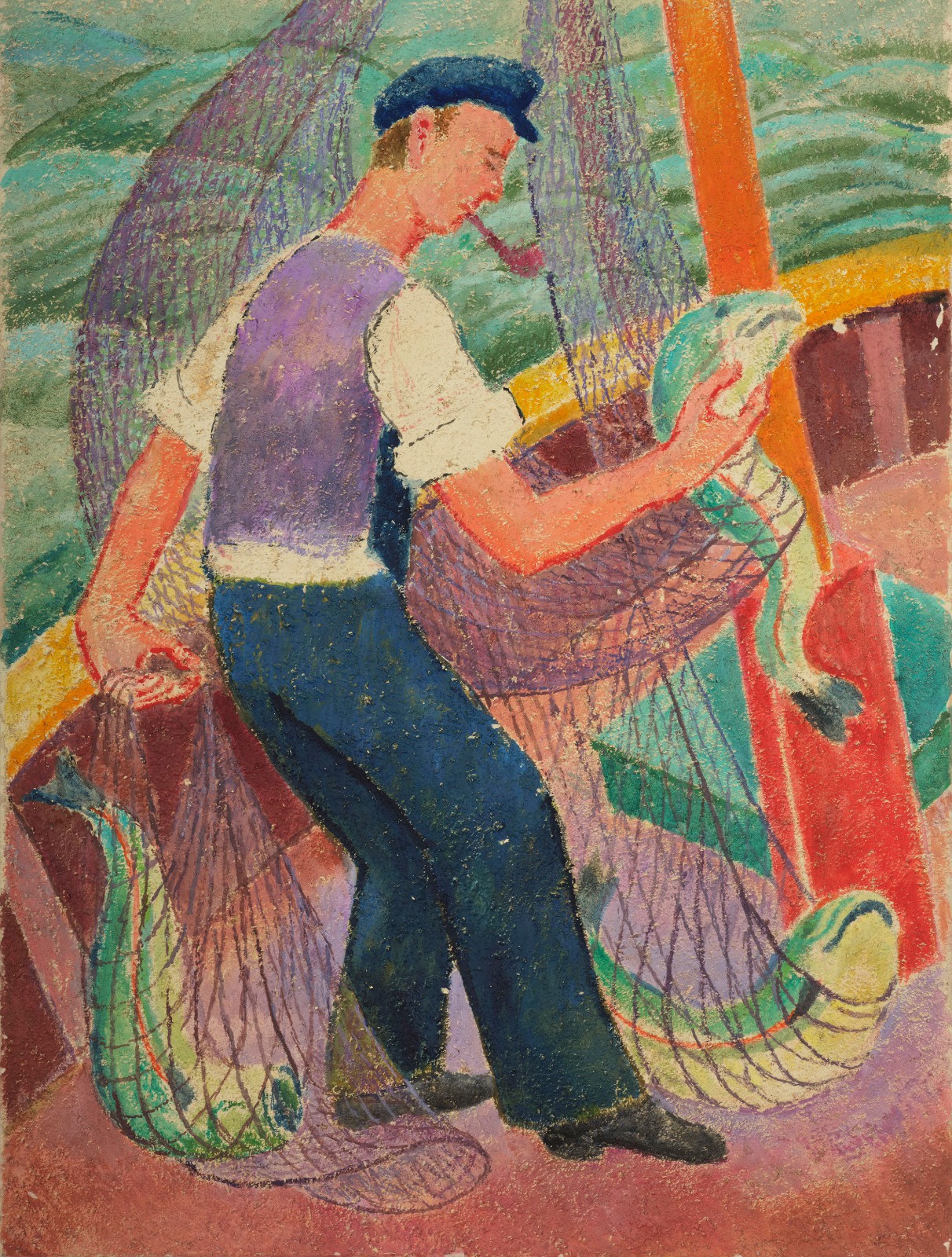 doppelseitig bemalt, verso Mohnblumen und weiße Blumen in Vase mit Husarenfigur von orangenem Vorhang auf karierter Decke, Anfang/Mitte 1930er Jahre