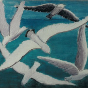 Fünf Möwen im Flug