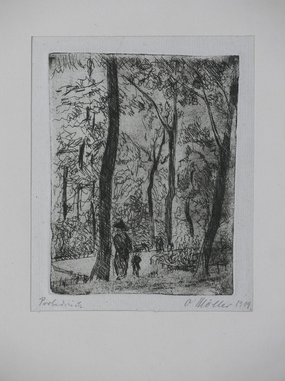 u.l. auf Passepartoutkarton eigenhändig handsigniert "Im Tiergarten", u.r. eigenhändig handsigniert "O. Möller 1909" und u.l. eigenhändig bezeichnet "Probedruck"Technik: