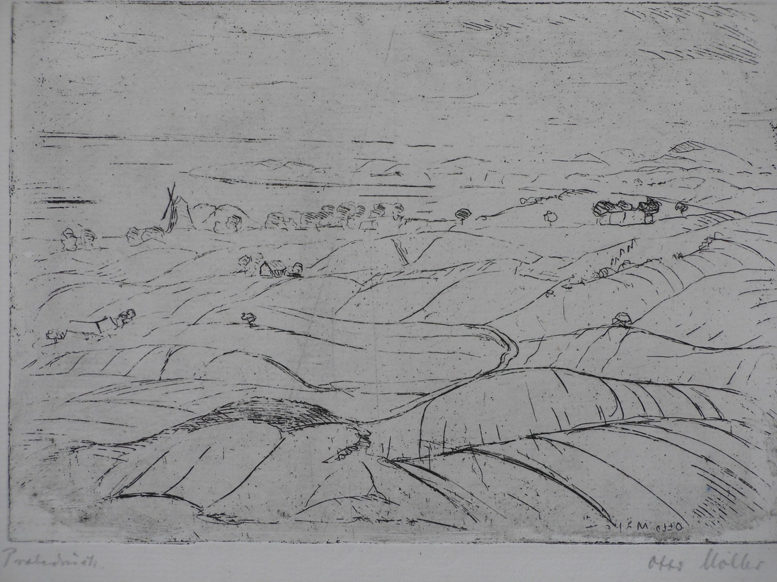 u.l.eigenhändig bezeichnet "Dänische Landschaft" und "Probedruck", u.r. spiegelverkehrt in der Platte "Otto Möller" und u.r. wahrscheinlich von MM handsigniert "Otto Möller"Technik: