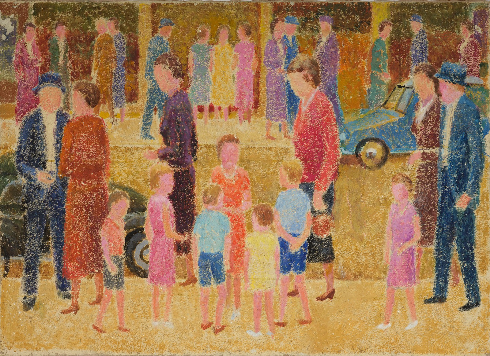 doppelseitig bemalt, verso Zwei Männer im blauen und gelben Anzug, beschnitten